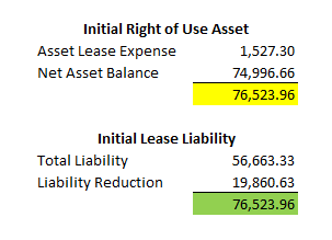 The amortization schedule shows the net activity for the first month and does not split out the beginning balance for the lease liability and ROU asset. Those amounts are calculated below: